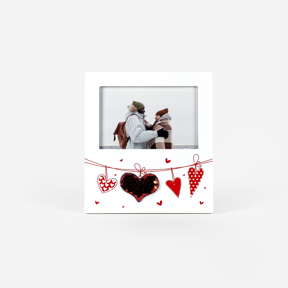 Moldura de alta qualidade, composta por uma estrutura em plástico duro transparente, que se faz acompanhar de um efeito de flocos de neve que surge quando a moldura é agitada.